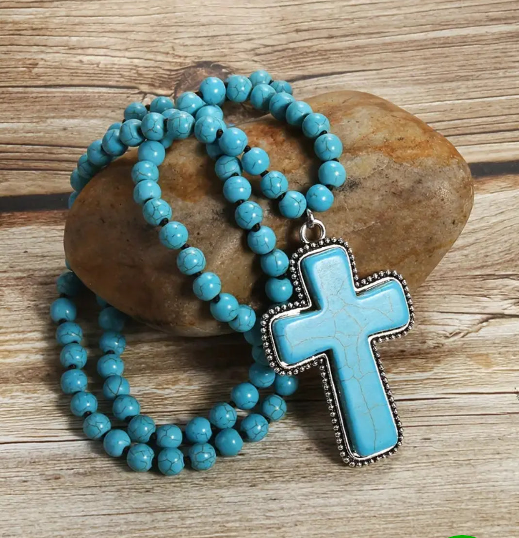 Bohemian Cross Necklace with8mm Beads. Hand knotted natural stone 33"