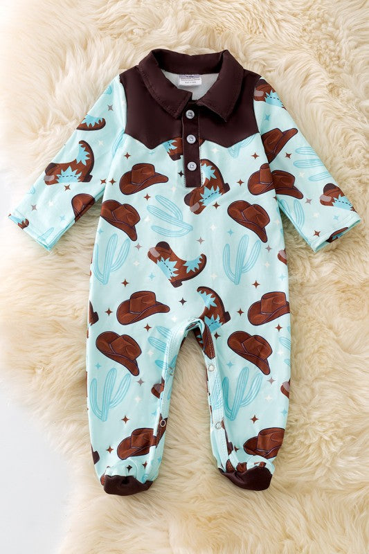 This blue baby onesie features a charming western cowboy boot print, adding a playful touch to your little one's wardrobe. Designed with built-in footies for warmth and comfort, it includes convenient snap closures for easy dressing and diaper changes. Combining style and functionality, this onesie is perfect for everyday wear with a touch of western flair. 95%POLYESTER 5%SPANDEX MILK SILK SOFT FABRIC FRONT BUTTONS SNAPS COLLAR FOOTIE WESTERN