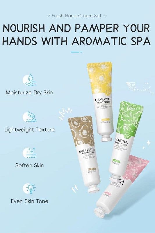 MOISTURIZING HYDRATE REPAIR HAND CREAM (30g/1.06oz) -SHEA BUTTER - ANTI WRINKLE & DRYNESS -MATCHA - REFRESHING & BRIGHTENING -SAKURA - WHITENING & NOURISHING -CAMOMILE - SOOTHING & HYDRATING -REFRESHING FRAGRANCE -REPAIR & SMOOTH ROUGH SKIN -PREVENT DRYNESS & CRACKING -EASY TO SPREAD, NON-GREASY *COLOR MAY VARY SLIGHTLY DUE TO MONITOR RESOLUTION*