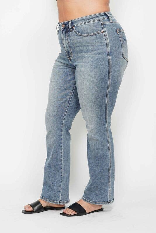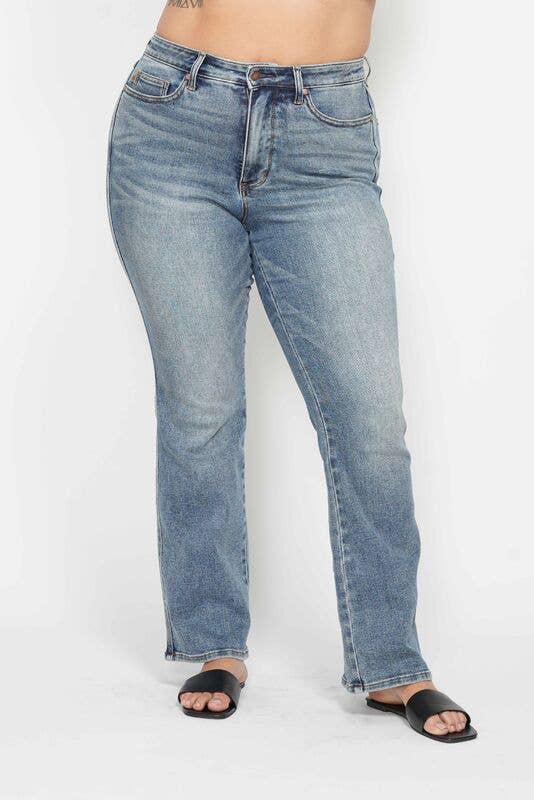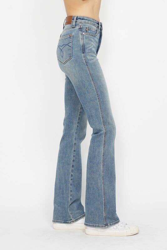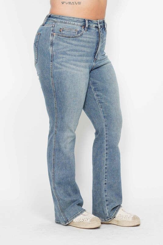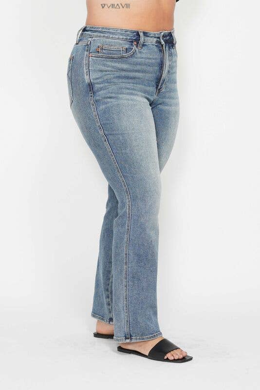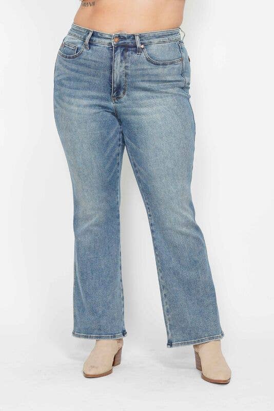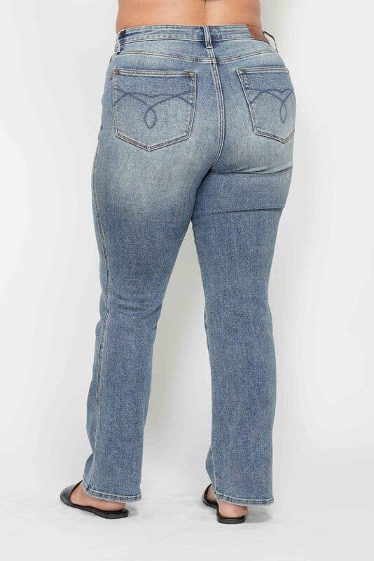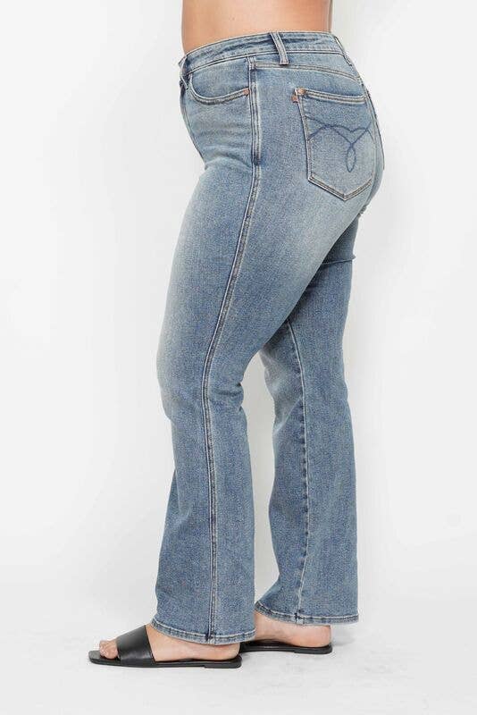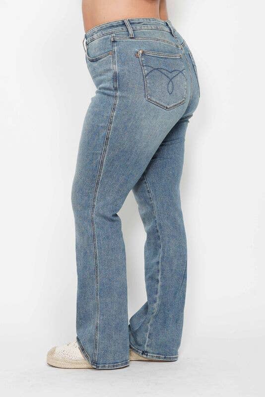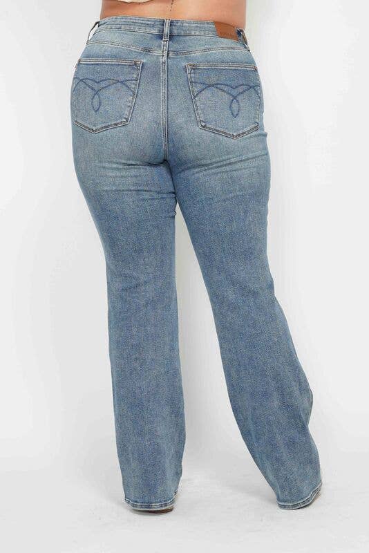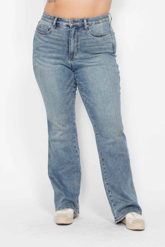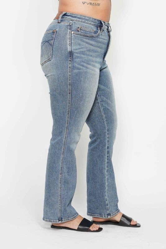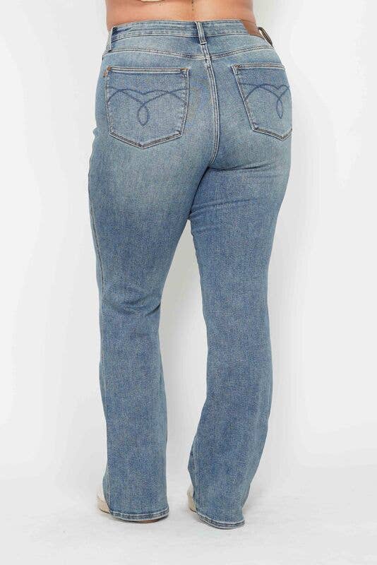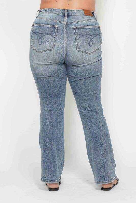 Our Multi Inseam Tummy Control High Waisted Bootcut jeans from Judy Blue Jeans are a perfect addition to your fall/winter wardrobe. These jeans are high-rise, featuring a 12" rise and are available in short, regular, and long inseams. They come in a medium wash and are embroidered on the back pocket for a stylish touch. These plus-size jeans are made from a blend of 76.2% cotton, 22.5% polyester, and 1.3% spandex, providing a comfortable fit with a slight stretch. They're designed for hand wash to maintain their quality. With a bootcut style, these jeans offer a trendy and comfortable fit for every denim aficionado.
