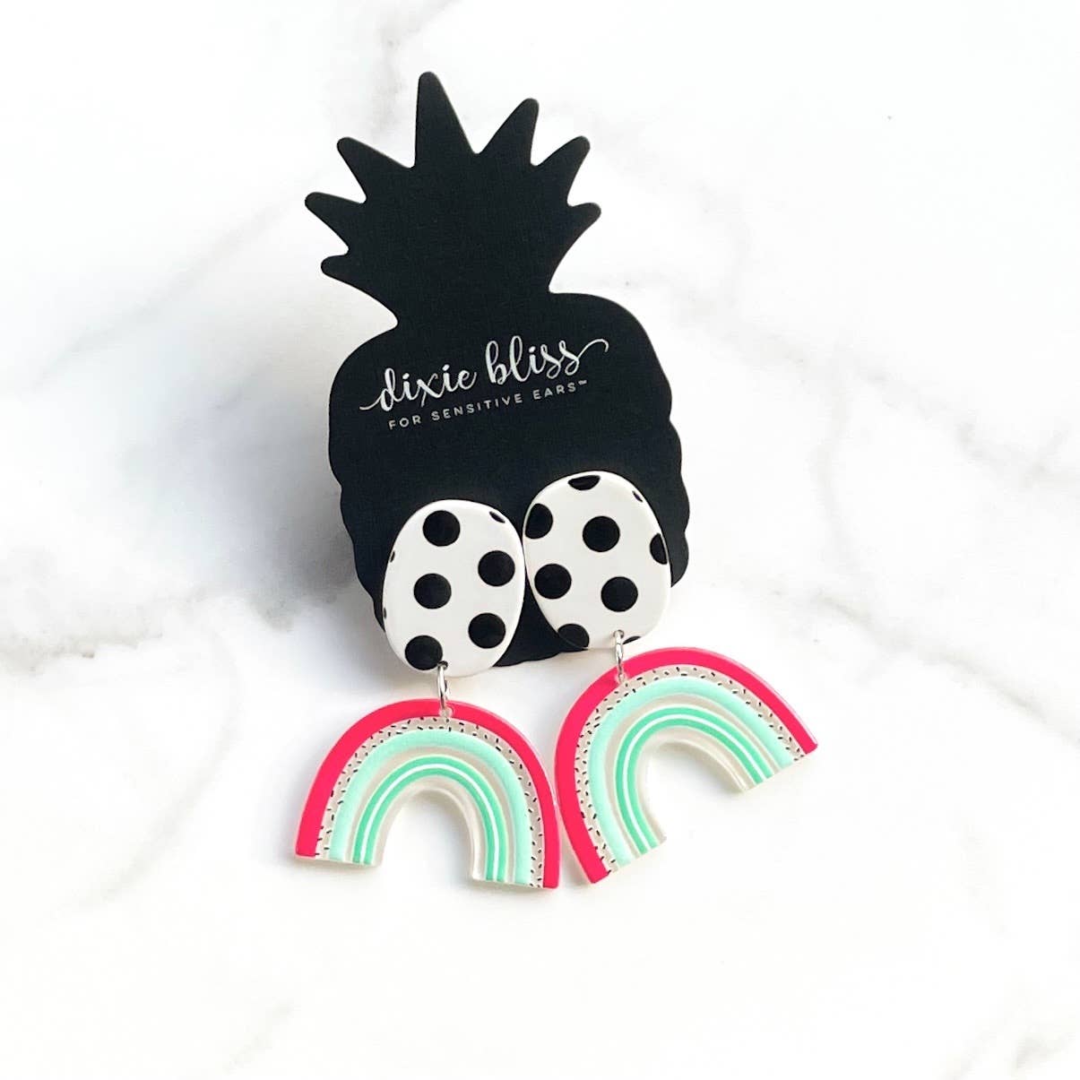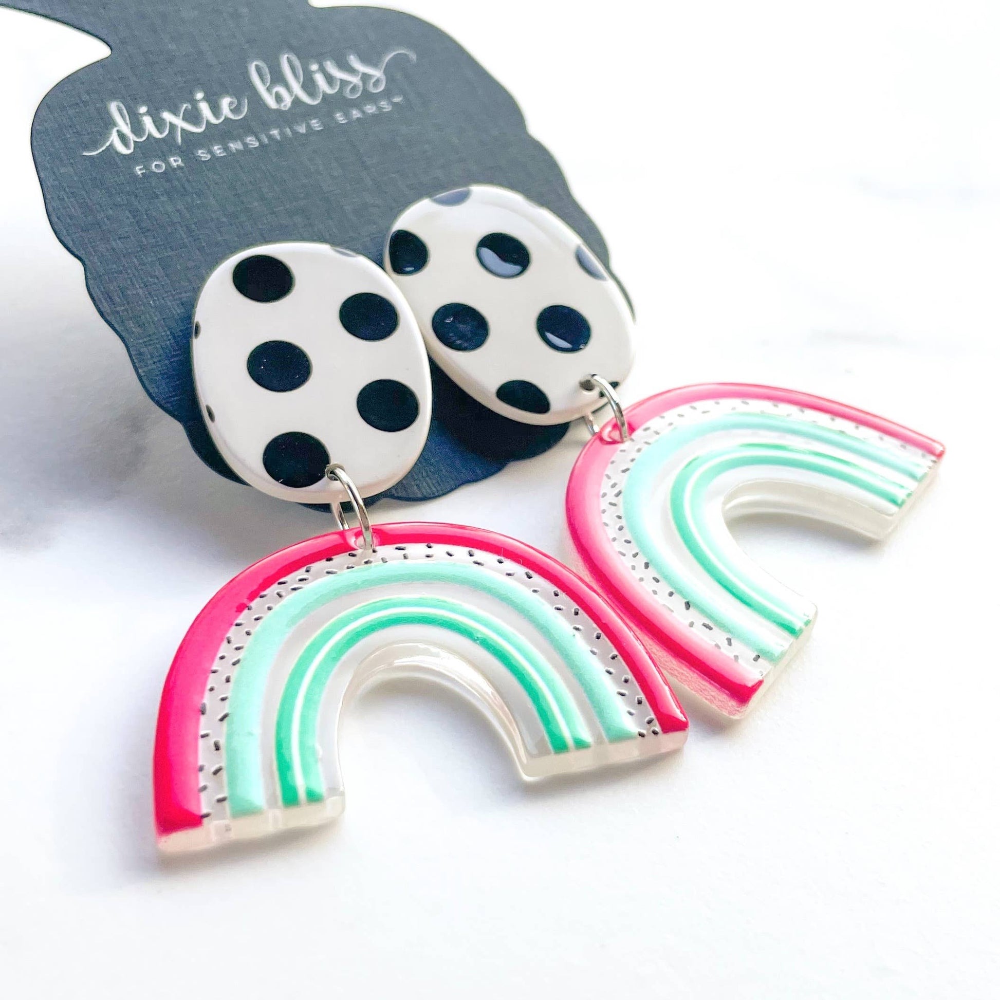 Rainbows Are Magic makes a statement and features: *Black and White Polka Dot Acrylic Stud *Mint & Fuchsia Rainbow Charm *Measures 2.2" from the top *Posts are Stainless Steel *Great for sensitive ears *Made in the USA