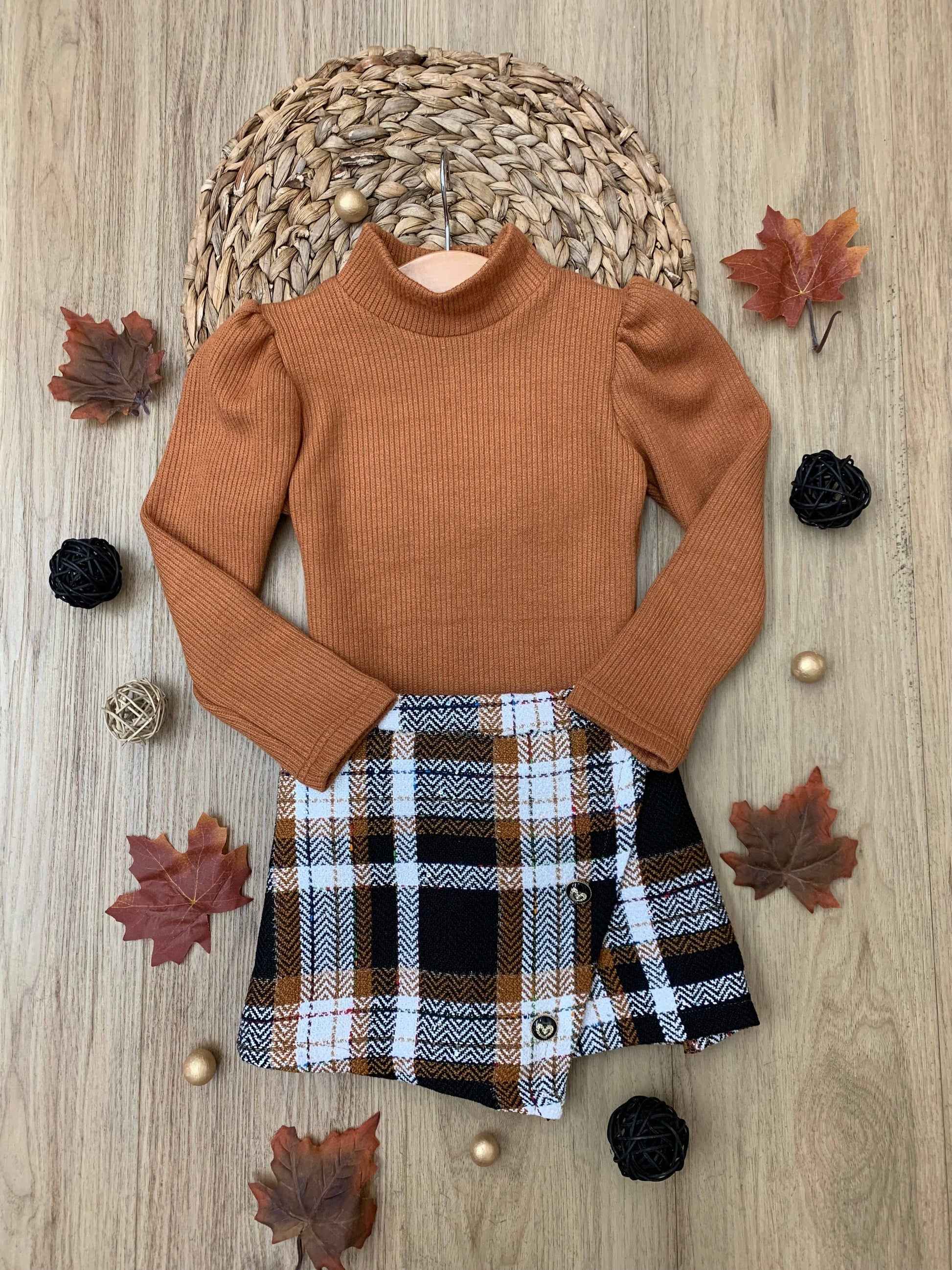 * Trendy rust turtleneck top and plaid skort set for a chic and stylish look