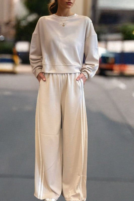 Stylish varsity striped two-piece set adds a sporty vibe. Crewneck pullover offers cozy comfort for daily wear. High-waisted elastic sweatpants ensure a snug fit. Ideal for errands, workouts and relaxing. |